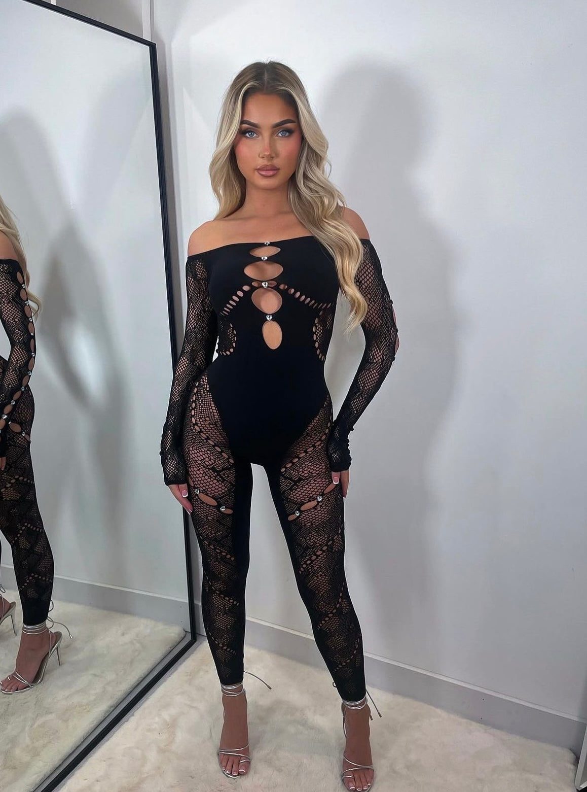 ¡Este jumpsuit es tu nuevo aliado para deslumbrar en grande! 🖤✨ Con detalles de pedrería en los brazos, piernas y el escote, te hará brillar en cualquier ocasión especial. Es perfecto para que te robes todas las miradas.Lo que te encantará: