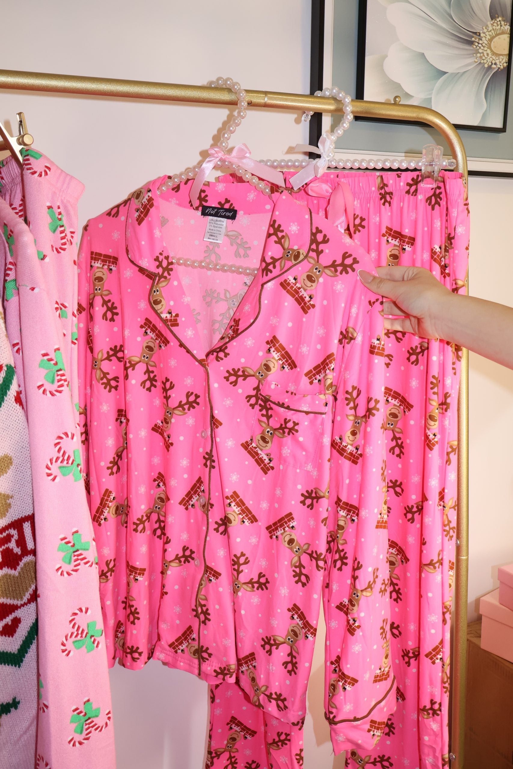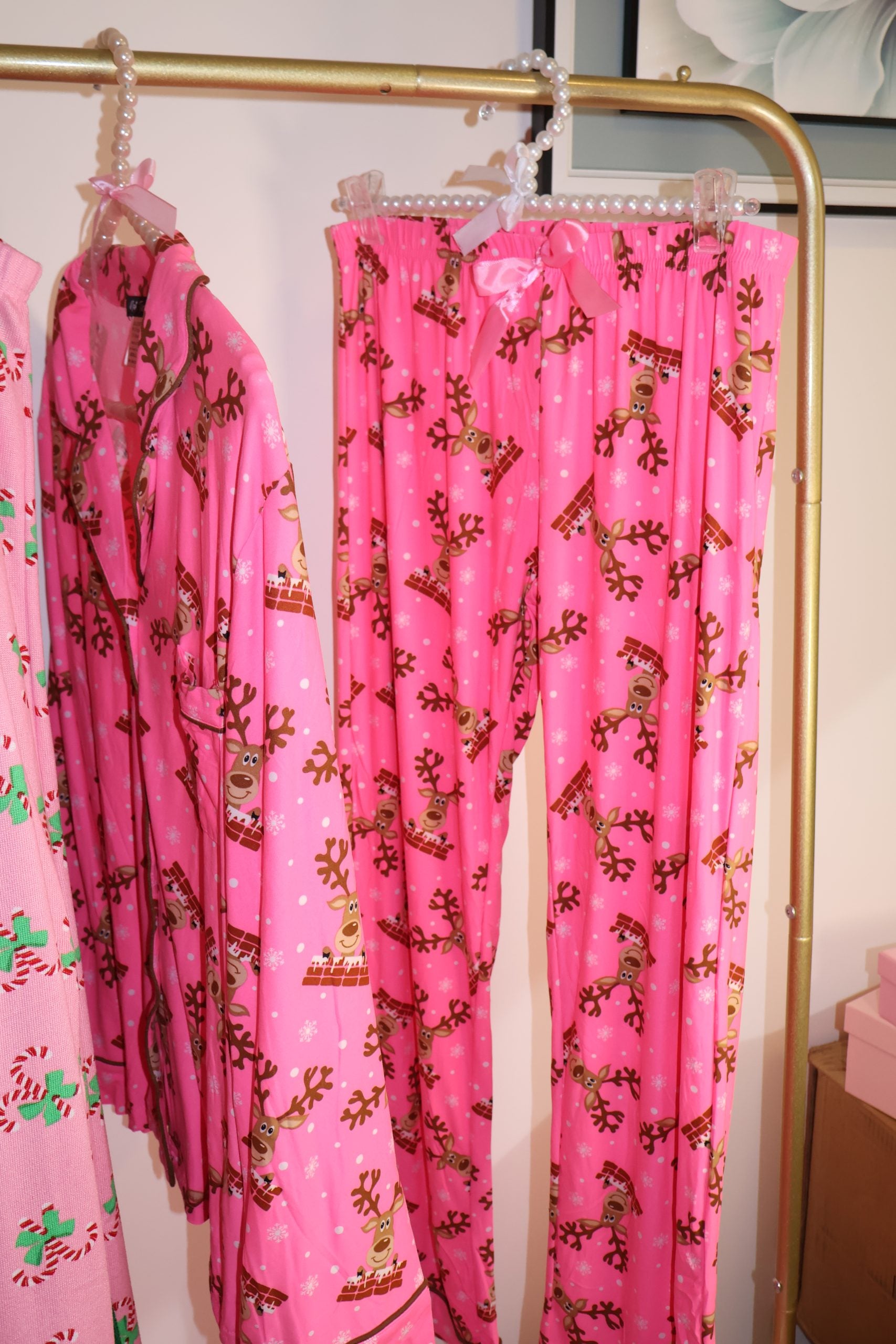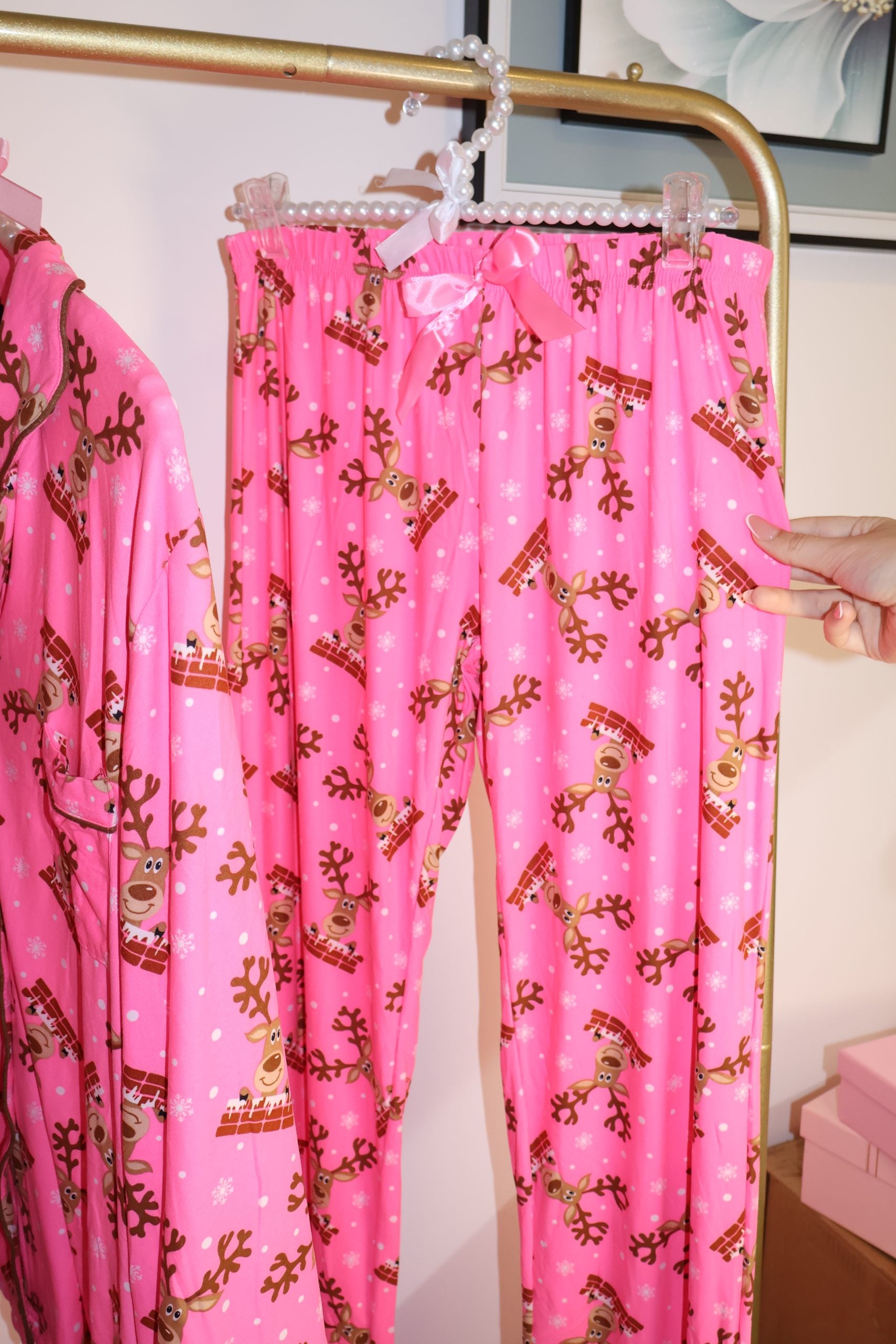 Confeccionado en una tela suave al tacto y decorado con renos y elementos festivos, este conjunto en tono rosa cálido es perfecto para crear recuerdos junto al árbol, descansar en casa o sorprender con el regalo más acogedor de la temporada.
